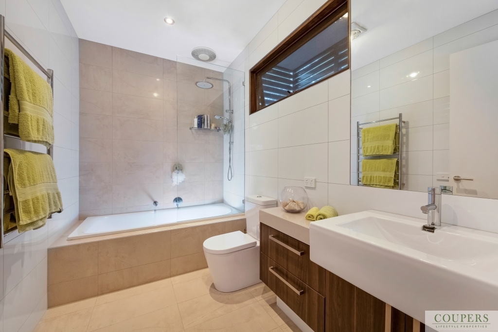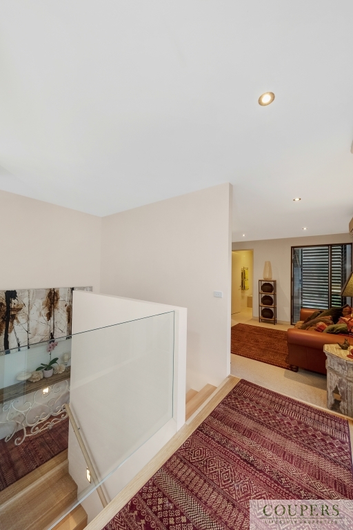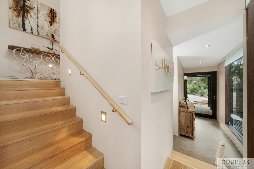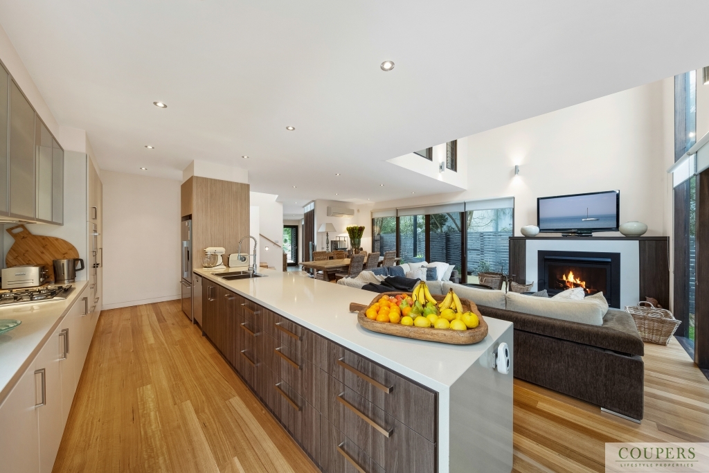 *Natural materials and clean design lines create the contemporary appeal.  The house features a dramatic void space through which one can enjoy the views from the open-plan living area downstairs and the generous master bedroom on the first floor. The quality interior finishes include: stone bench-tops; new stainless steel Bosch kitchen appliance;, polished timber floors; new, quality carpeted bedrooms; gas fireplac;, heating and cooling including ceiling fans; fully-tiled bathrooms.