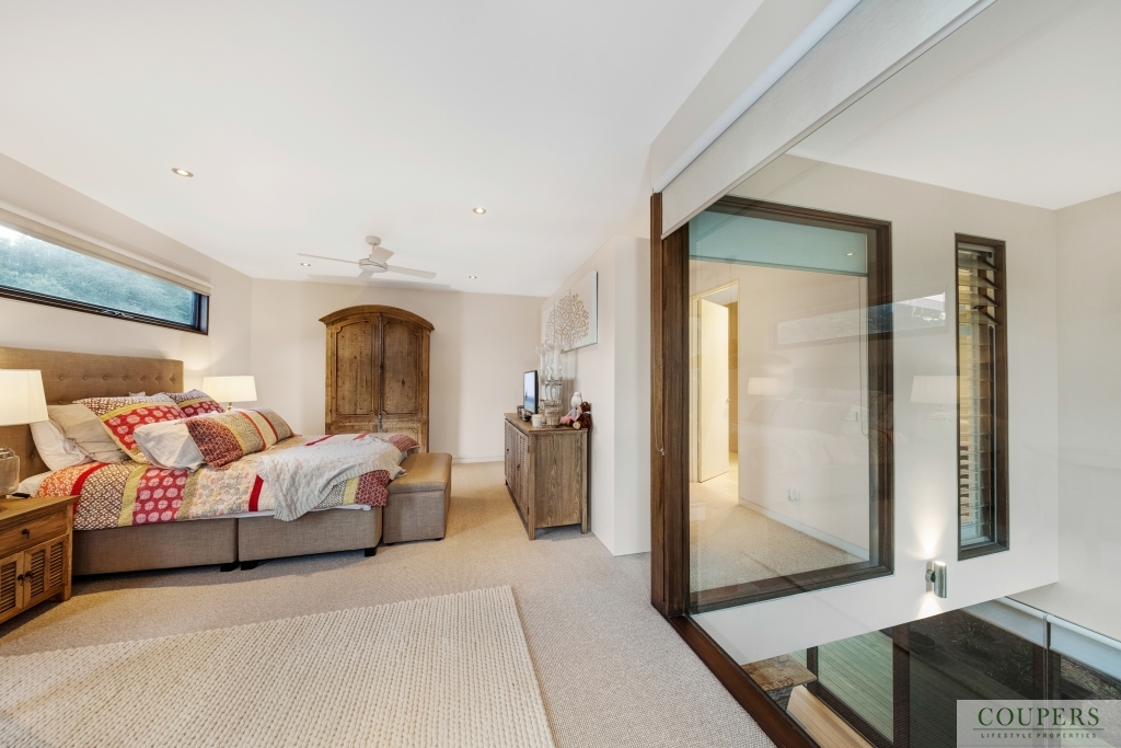The house has three large bedrooms including a master with ensuite, two living areas including an expanse of light-filled living space opening onto private decks and courtyard, welcoming the landscape into the home.