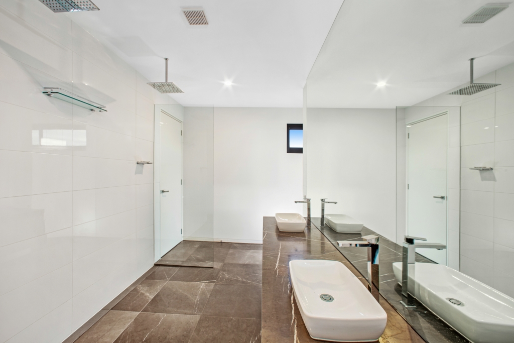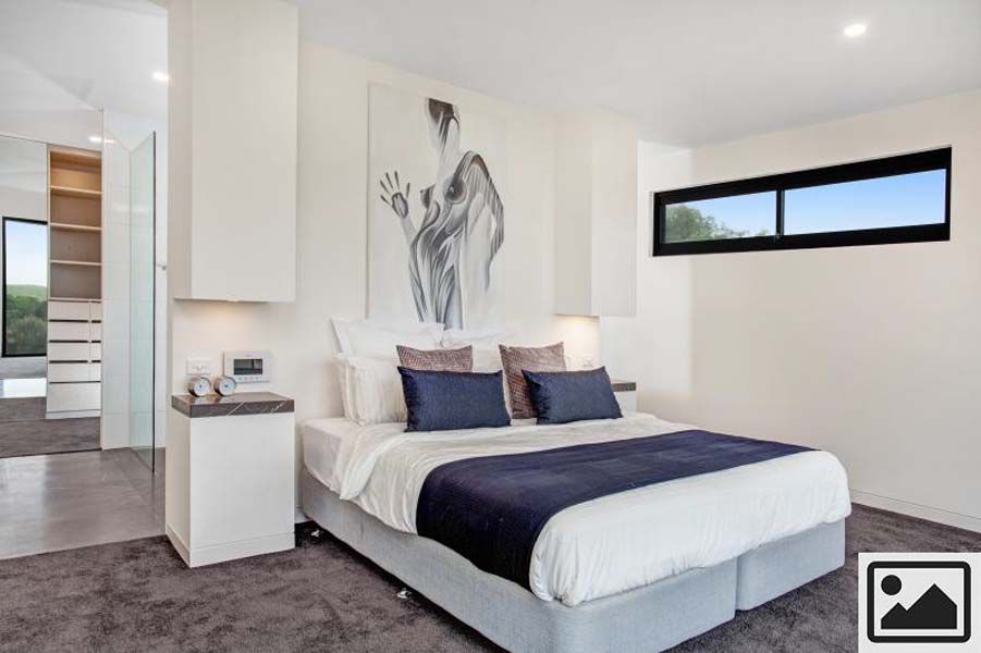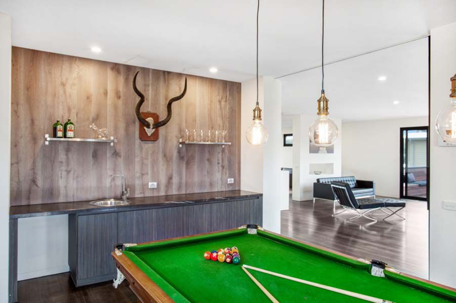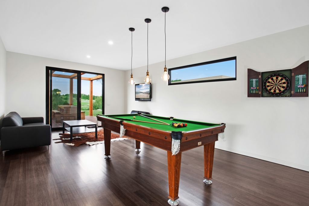 Upstairs opens to ground level overlooking the Open Championship Course of Moonah Links.  Here  is the living and entertaining spaces including a billiard room, and the master bedroom suite - all with sweeping views. These living spaces include two sitting areas, spacious dining area, gourmet kitchen and separate living/billiard room with bar and guest powder room.